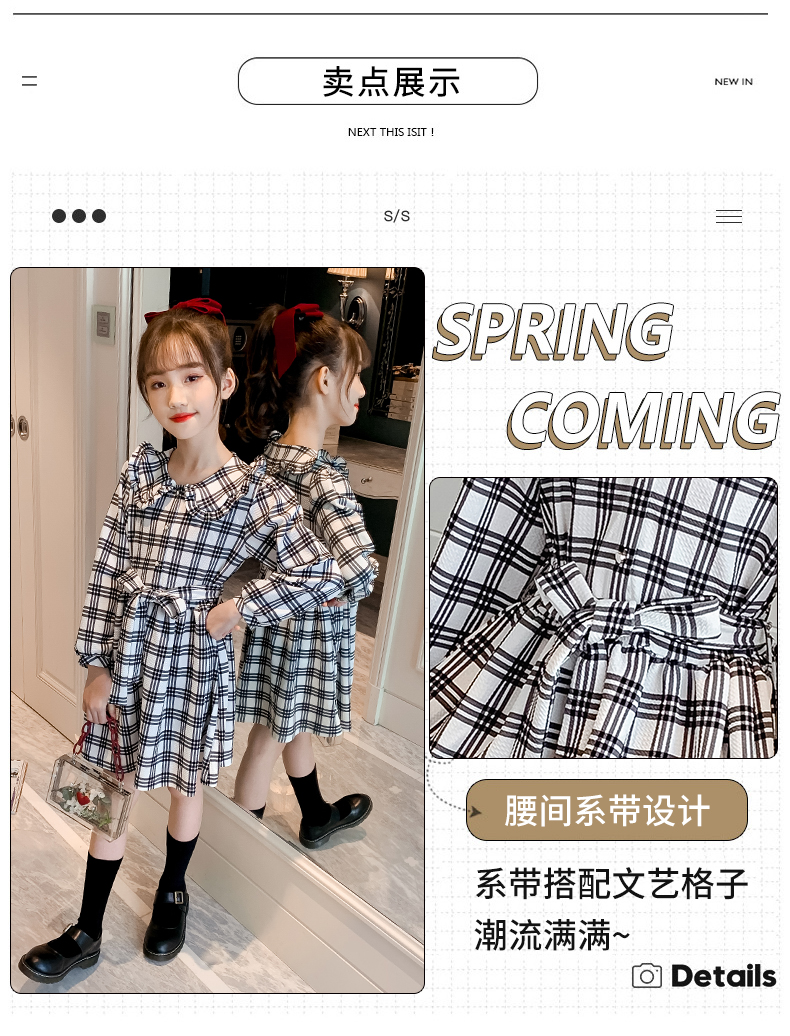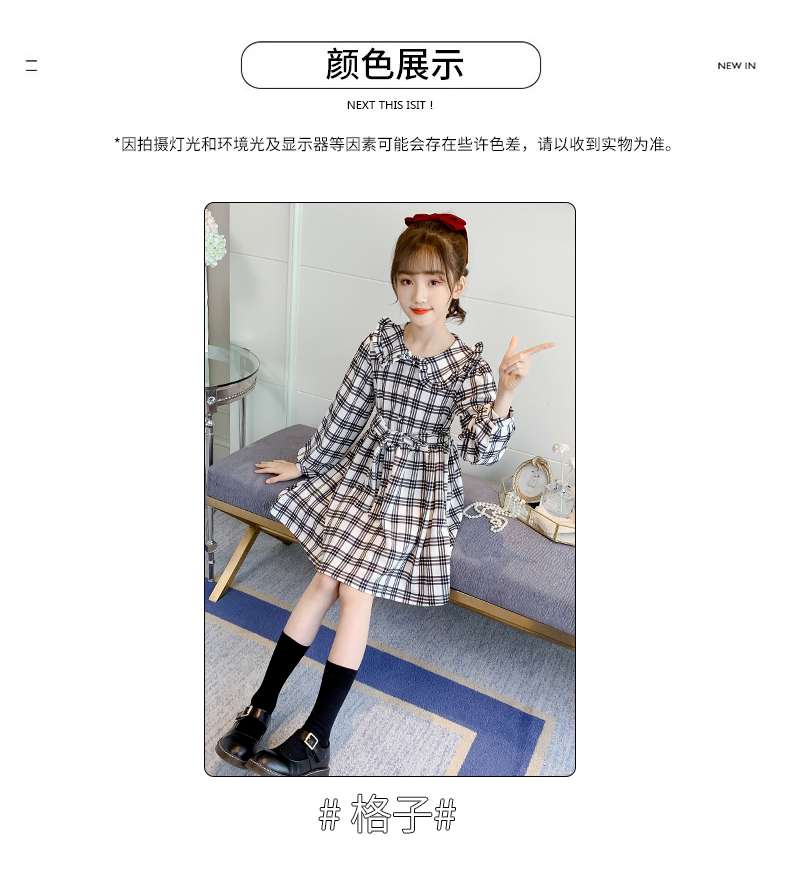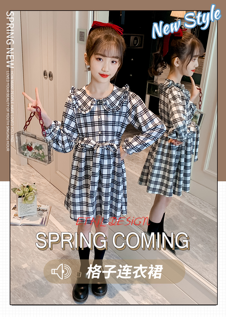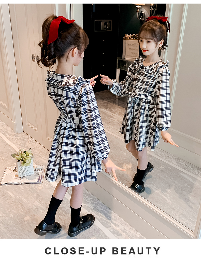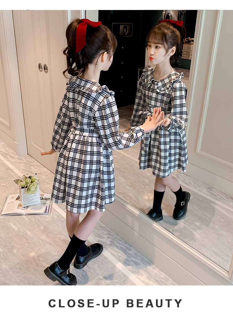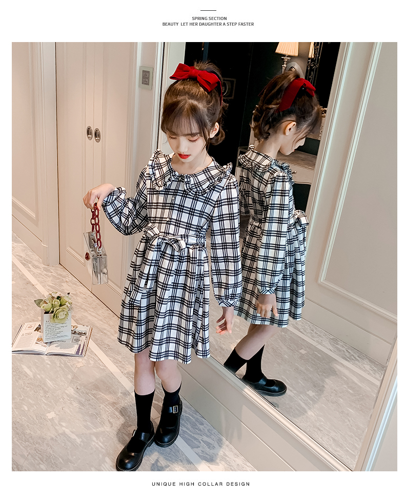浪莎韓版女童花邊翻領黑白格子連衣裙2021春裝新款兒童長袖公主裙